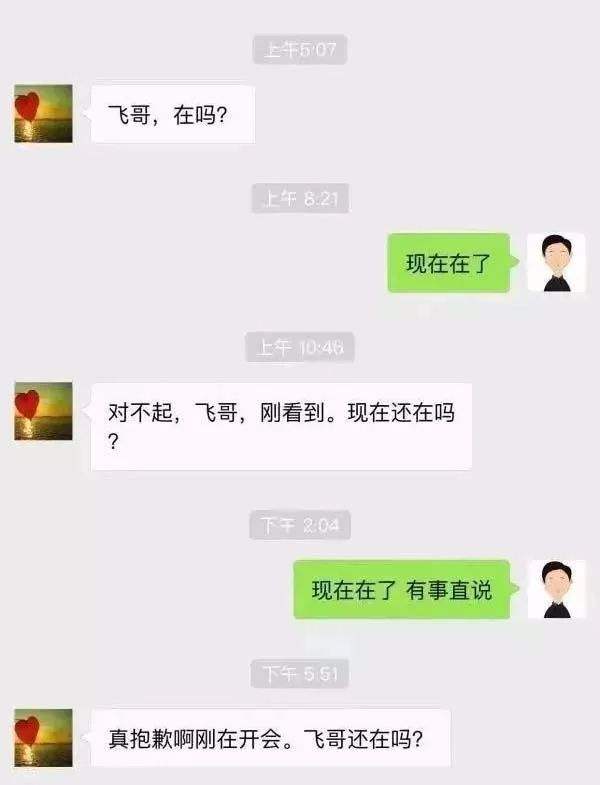 另一方面,當(dāng)你問對(duì)方有什么事時(shí),如果對(duì)方暫時(shí)不在,隔了一會(huì)兒,又會(huì)回復(fù)你,這下在了,你還在嗎?這樣一來二去,還沒說到正題時(shí),你已經(jīng)崩潰了。